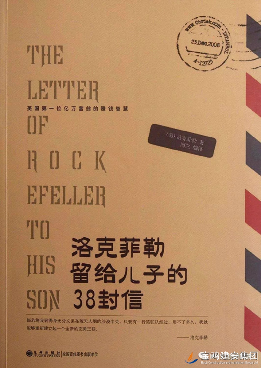 單位:第八項目部 作者:張兆陽 中國有句古話:至樂莫若讀書,至要莫若教子。如何教育引導(dǎo)好年輕人,長久以來都是世界各個階級父母所關(guān)注的話題。洛克菲勒,標(biāo)準(zhǔn)石油公司創(chuàng)立者、全球首富。2009年福布斯公布“美國史上十五大富豪”,洛克菲勒名列榜首。這樣一個商業(yè)巨擘,同樣也在研究如何指引年輕一代。在這本書中,就淋漓盡致地呈現(xiàn)出了他對教育的見解。